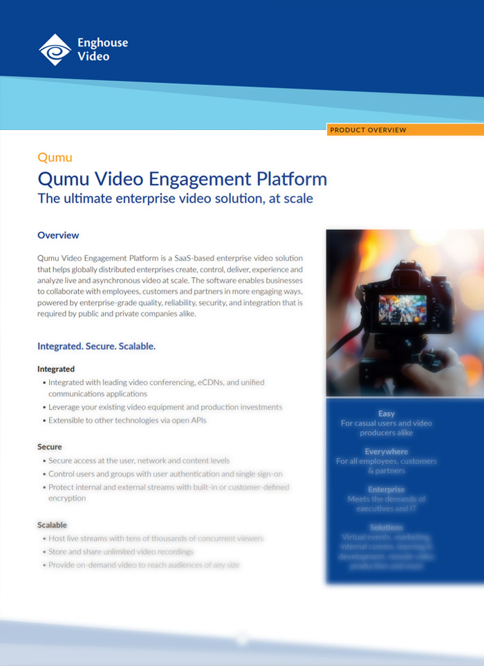 Qumu Video Engagement Platformは、SaaSベースの企業向け動画ソリューションで、グローバルに分散する企業を支援します。 作成する, コントロール, 届ける, 経験 そして 分析する ライブ・ビデオや非同期ビデオを大規模に配信することができます。このソフトウェアにより、企業は従業員、顧客、パートナーとのコラボレーションをより魅力的な方法で実現することができます。このソフトウェアは、エンタープライズグレードの品質、信頼性、セキュリティ、および公共企業や民間企業で必要とされる統合機能を備えています。詳しくは製品概要をご覧ください。